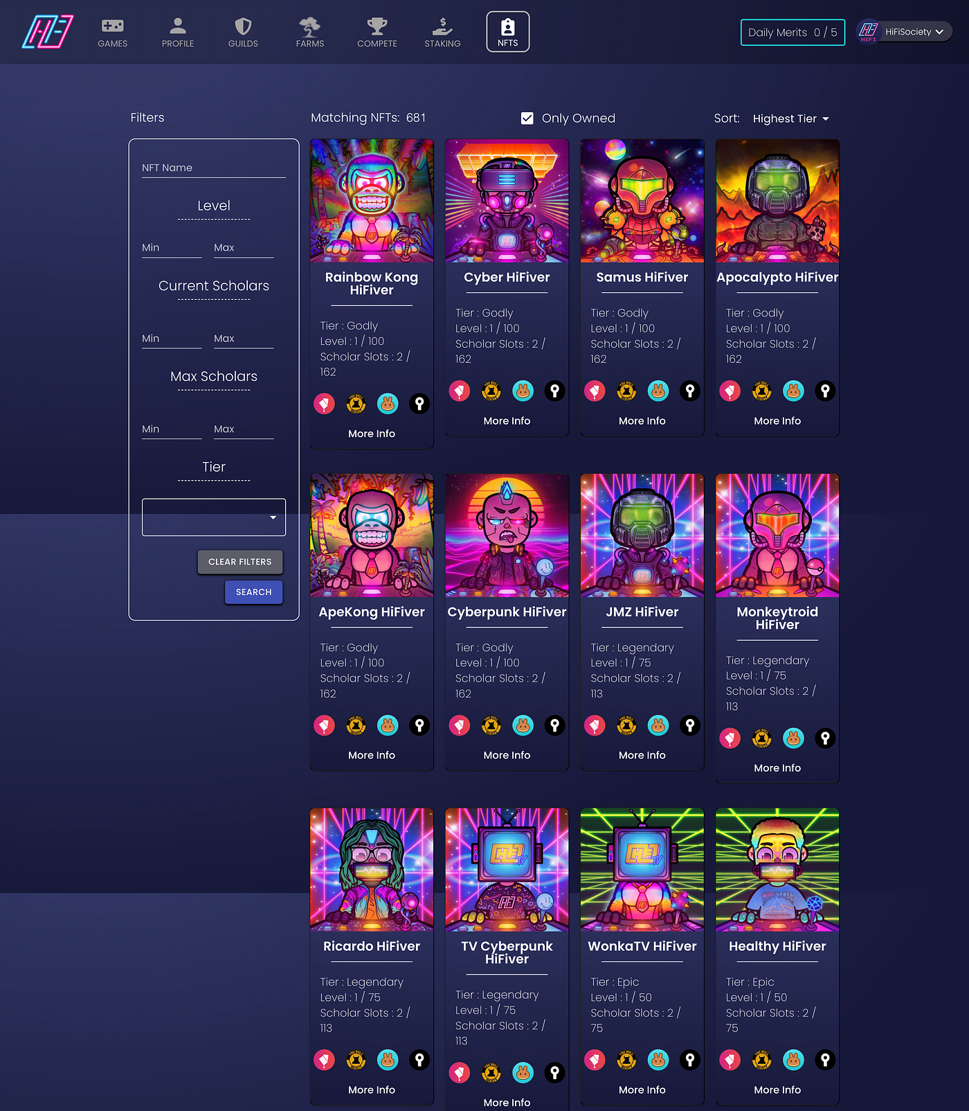 We were humbled when invited to list our first collection on 4 popular NFT marketplaces on the Binance Chain. Once you acquire your first NFT, you’ll need to begin leveling it up to increase your ability to onboard more scholars (who will earn for you). This is accomplished by staking $HIFI as collateral against your NFT.